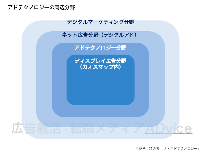 まずデジタルを活用したマーケティング活動である「デジタルマーケティング」の一部として、インターネット広告があります。さらにネット広告の一部としてテクノロジーを活用した広告領域、つまりアドテクノロジーが存在するのです。